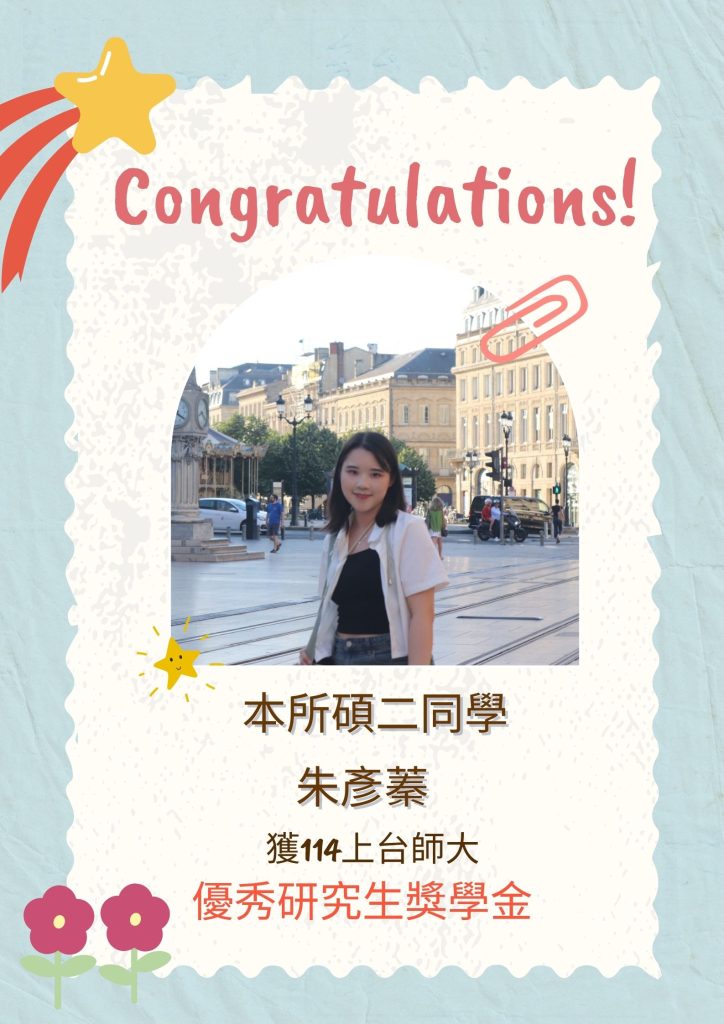 賀!本所學生朱彥蓁 榮獲114學年度上學期優秀研究生獎學金 ~new~ 恭喜本所優秀的同學獲得獎學金!!✨碩二朱彥蓁同學✨榮獲114學年度上學期優秀研究生獎學金! Post author:giect Post published:2025-11-14