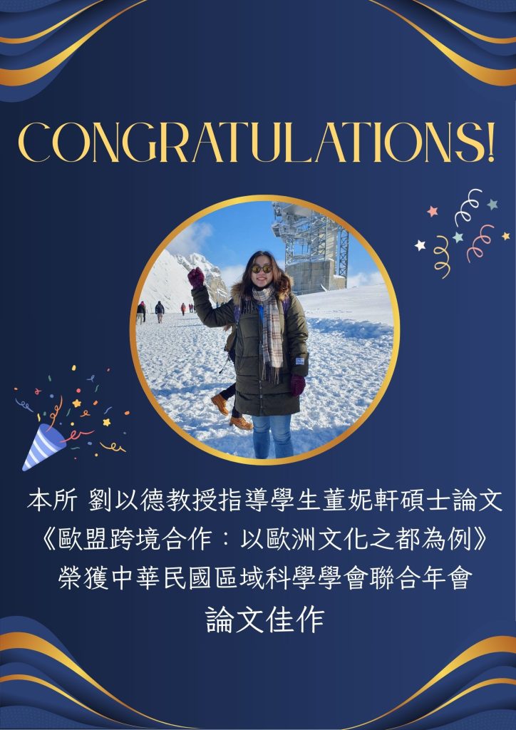 賀!本所學生董妮軒 榮獲中華民國區域科學學會聯合年會佳作獎 ~new~ 恭喜本所劉以德教授指導學生董妮軒碩士論文《歐盟跨境合作:以歐洲文化之都為例》榮獲中華民國區域科學學會聯合年會佳作獎! Post author:giect Post published:2025-11-26